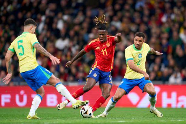 虽然没能如愿拿下胜利,但比起三天前输给哥伦比亚一战,本场主力尽出的西班牙表现要出色很多,没能赢下胜利更多是因为自身失误,巴西队的三个进球分别来自门将西蒙的直接失误、定位球和点球,而西班牙虽然也有两次点球破门,但持续施压和进攻的节奏基本贯穿了全场。本场直到第81分钟,德拉富恩特才做出全场第一次换人,罗德里、法比安、奥尔莫均打满了全场,表现最为惊艳的亚马尔也留到了全场第90分钟才被替换下场,看得出他还是希望能够在主场赢下这场强强对决,最终在基本全场占优的情况下,只是部分细节决定了成败。